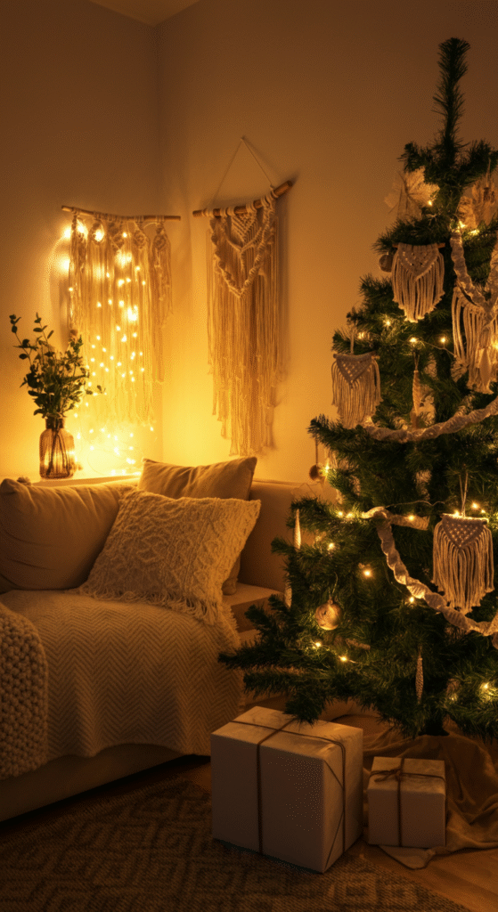 Hang a macramé wall hanging behind your couch and wrap it with fairy lights for a soft, enchanting glow. Or use small macramé ornaments on your Christmas tree — think knotted angels, stars, or tassels.