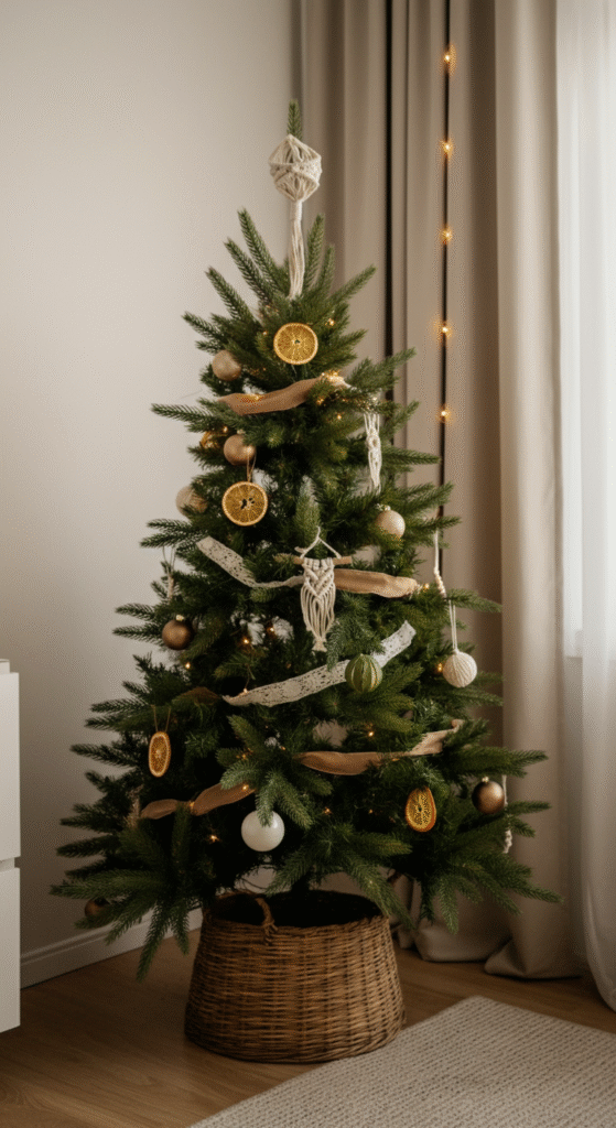For small apartments, consider a minimal tabletop tree in a woven basket. It saves space and adds a touch of rustic charm.