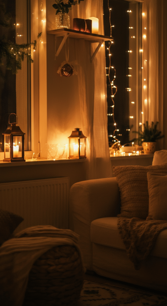 Combine warm-toned fairy lights, lanterns, and candles to create a glowing haven. Wrap string lights around your shelves or along your windows. Add a few pillar candles on wooden trays and mix in glass votives for variety.