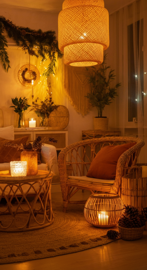 Boho interiors thrive on soft, layered lighting — and Christmas gives the perfect excuse to play with it.