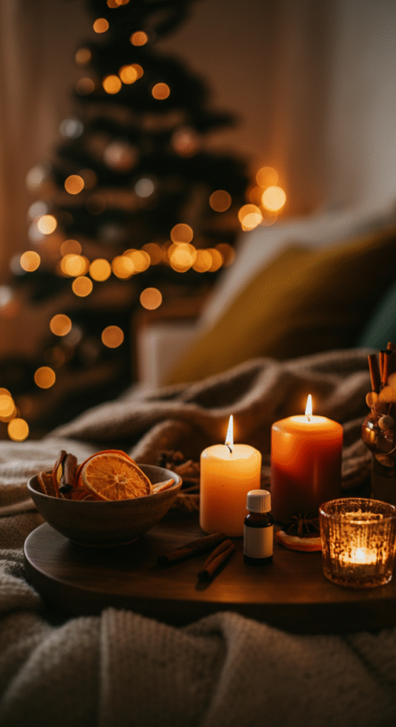 Diffuse essential oils like cedarwood, orange, or clove. Place bowls of dried orange peels and cinnamon sticks around the room. Light soy candles with warm notes of vanilla or amber.