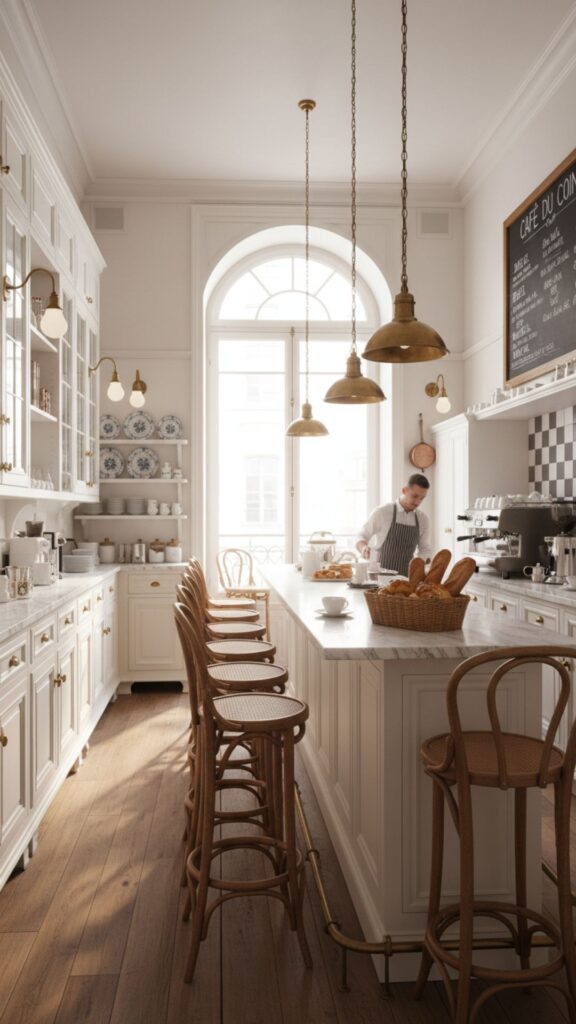 Inspired by 19th-century café culture, the Bentwood stool brings a touch of European sophistication to any kitchen. Characterized by its curved wood frame and often featuring a woven cane seat, this style is lightweight yet durable. It pairs beautifully with marble countertops and white cabinetry, adding warmth and organic texture.