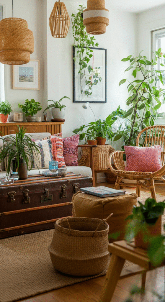 Forget matching sets—bohemian design celebrates individuality. Combine a mid-century armchair with a vintage wooden trunk and a modern rattan coffee table. This eclectic mix gives your space a lived-in and authentic feel.