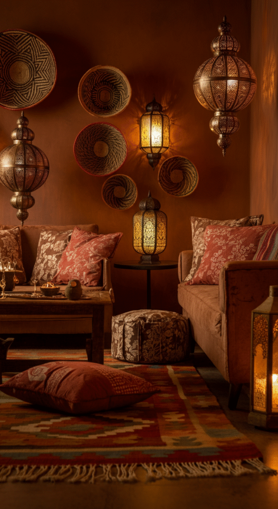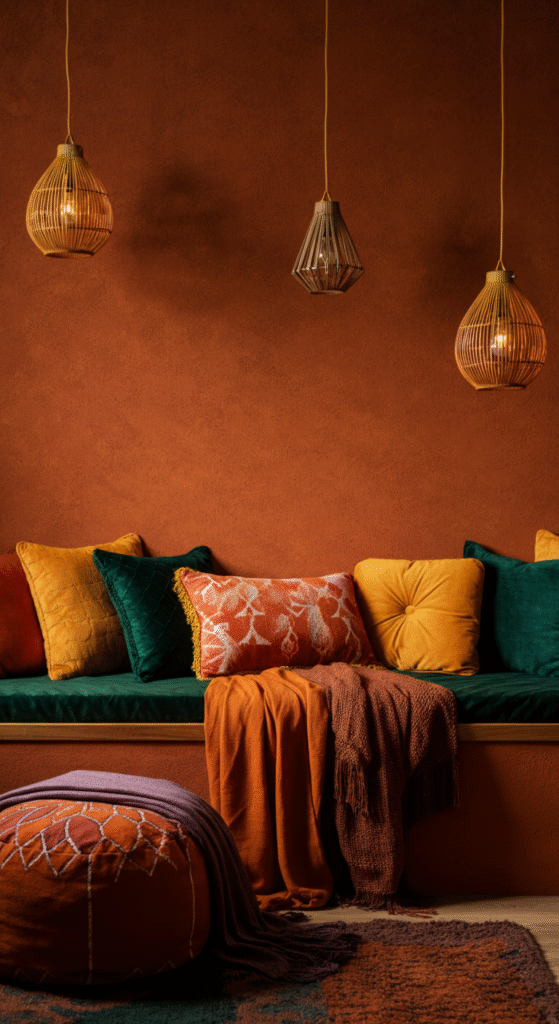 Start with a neutral base like cream or beige on your walls and sofa, then build layers with colorful fabrics and patterns. Moroccan rugs, ikat prints, and embroidered throws add depth and interest. The more texture, the better—it’s the contrast that creates coziness.