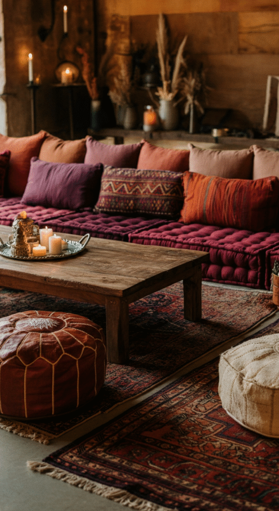 Boho spaces embrace comfort and informality. Swap traditional sofas for floor cushions, poufs, or low wooden benches draped with throws. Create cozy nooks where people can lounge, read, or chat freely.