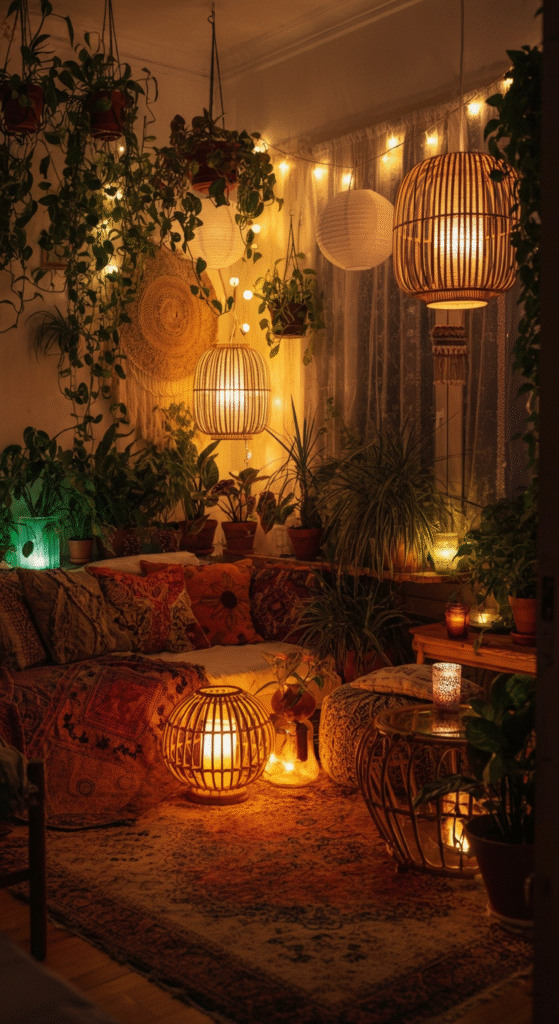 A mix of woven lampshades, paper lanterns, and string lights instantly transforms a plain room into a cozy boho retreat.