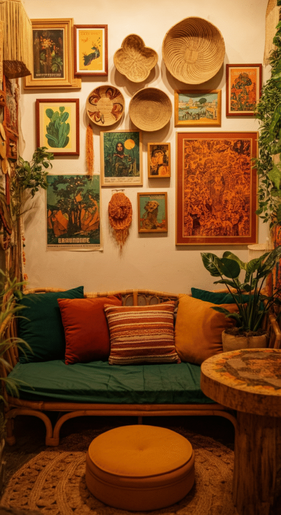 Gallery walls are a hallmark of boho décor. Mix frame styles, sizes, and even mediums. It doesn’t have to be perfect—boho beauty lies in imperfection.