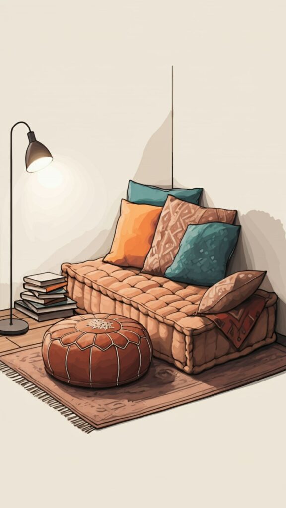You don’t need elaborate furniture to create a deeply relaxing reading spot. A minimalist floor cushion corner embraces a low-profile, bohemian aesthetic that feels both grounded and incredibly inviting.