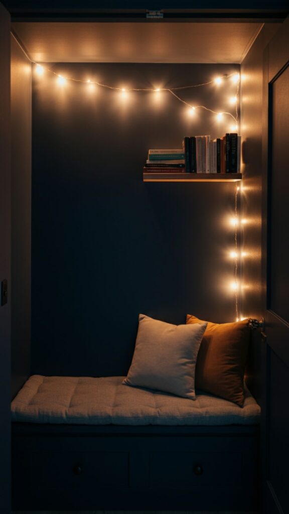 Use battery-powered, stick-on LED lights or fairy lights under a shelf for a magical glow. When you close the door, the rest of the world disappears.