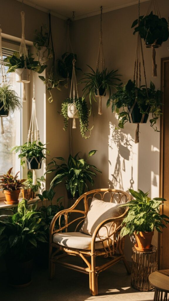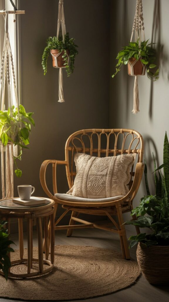 Choose a corner that receives ample natural light. The star of this nook will be a comfortable chair, like a rattan armchair or a hanging macrame chair.