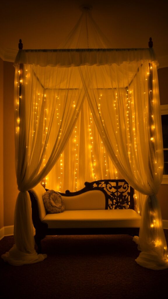 Weave strings of warm-white fairy lights through the fabric of the canopy to create a magical, starry-night effect.