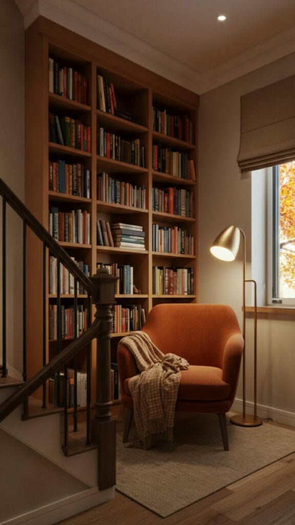 The key is using vertical space. Install floor-to-ceiling bookshelves along one wall. If the landing is narrow, shallow bookshelves are perfect for paperbacks.