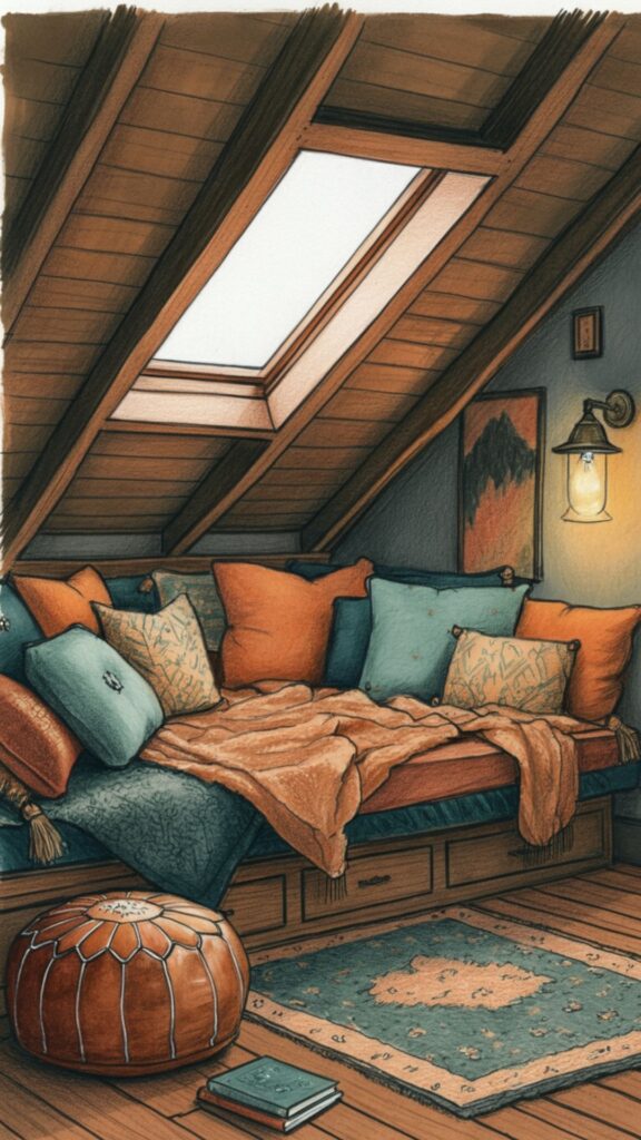 Use the vertical walls for storage by installing custom-built shelves that fit the angles of the room. A skylight is the ultimate feature, allowing you to read by natural light or stargaze at night.