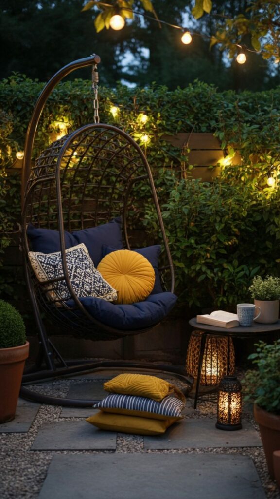Surround your swing with potted plants. A small outdoor side table is essential for holding your book and a cool drink. An outdoor rug adds a touch of indoor comfort.