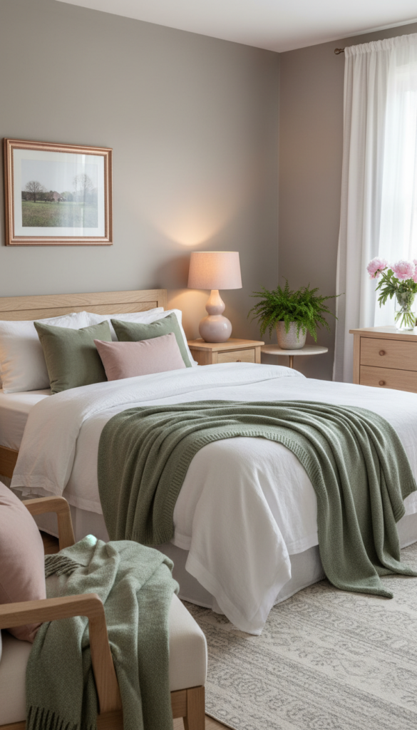 Soft sage, mint, or olive greens are perfect for creating a calming, serene atmosphere in the bedroom.