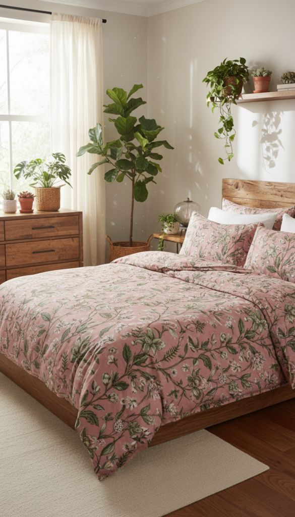 For a playful, yet serene, twist on traditional bedding, opt for a pink and green bedding set featuring botanical prints. The soft, leafy green patterns on a pink background can create a whimsical, nature-inspired vibe that immediately makes your bedroom feel fresh and inviting.