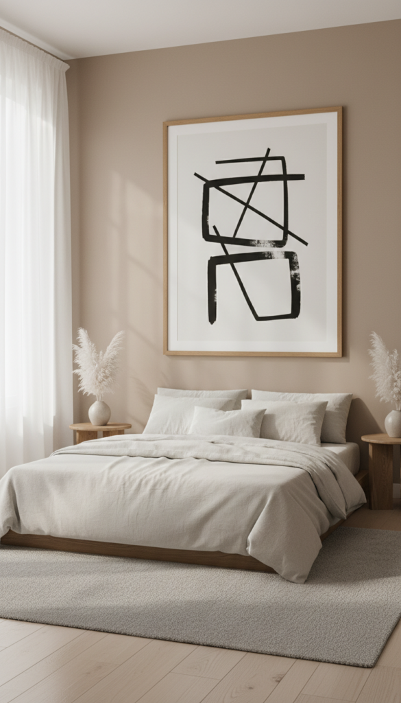 Rather than overcrowding the walls with multiple pieces of art, choose one or two impactful artworks that resonate with the room’s design. A single, bold piece of art or a carefully framed photograph can serve as the room’s focal point without detracting from its minimalist vibe.