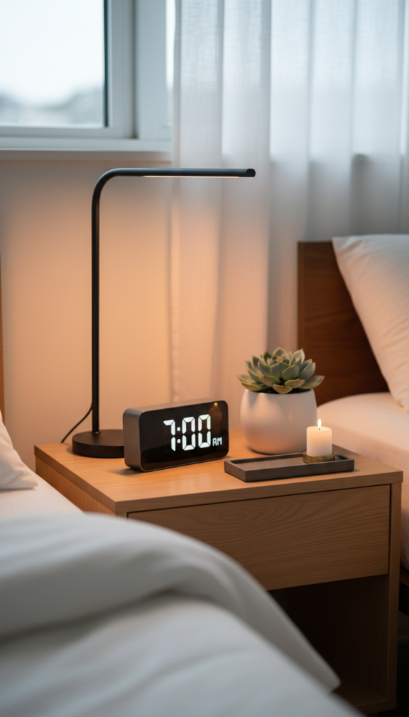 Keep only the essentials on your nightstand, such as a lamp, clock, or book. Avoid stacking items or leaving gadgets to maintain a clean and organized look.