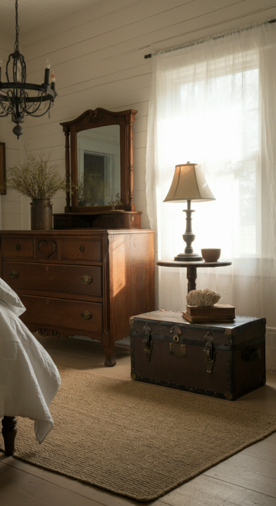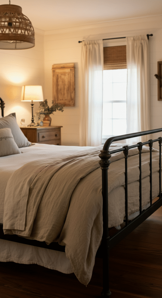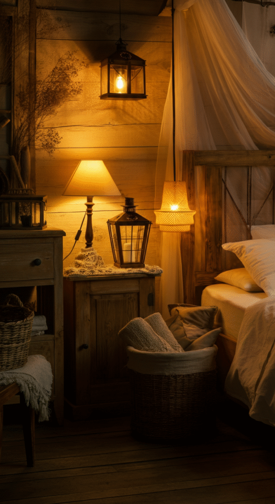 Lighting can completely transform how rustic your bedroom feels. Lamps with warm toned bulbs, hanging lantern style lights, or sconces create a gentle glow that feels peaceful. Harsh white lighting ruins the farmhouse charm instantly.