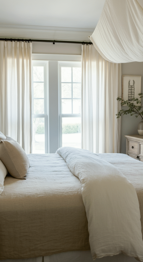 A little myth to break here. Many people think farmhouse bedding must always be white, but that is not true at all. Cream, beige, taupe, sage, dusty blue, or even tiny floral patterns add personality without killing the calm energy of the space.