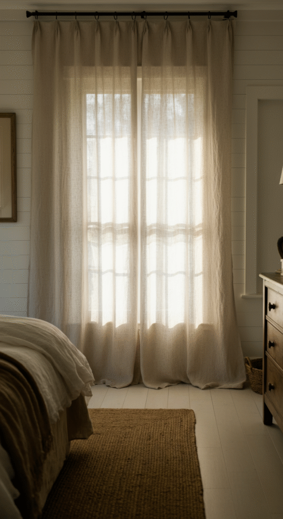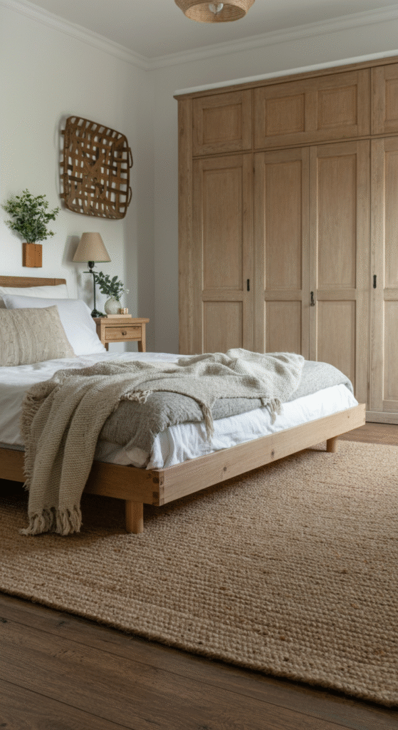 Rugs are not just decorative in farmhouse bedrooms. They add warmth, soften footsteps, and make the room feel grounded. Layering a jute rug with a soft cotton or wool rug on top creates an amazing rustic combo.