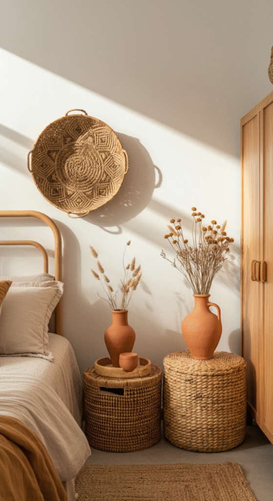 Farmhouse style is deeply connected to nature. Decor pieces like woven baskets, clay vases, dried flowers, plants, wooden trays, or simple framed art add soul without cluttering the space.