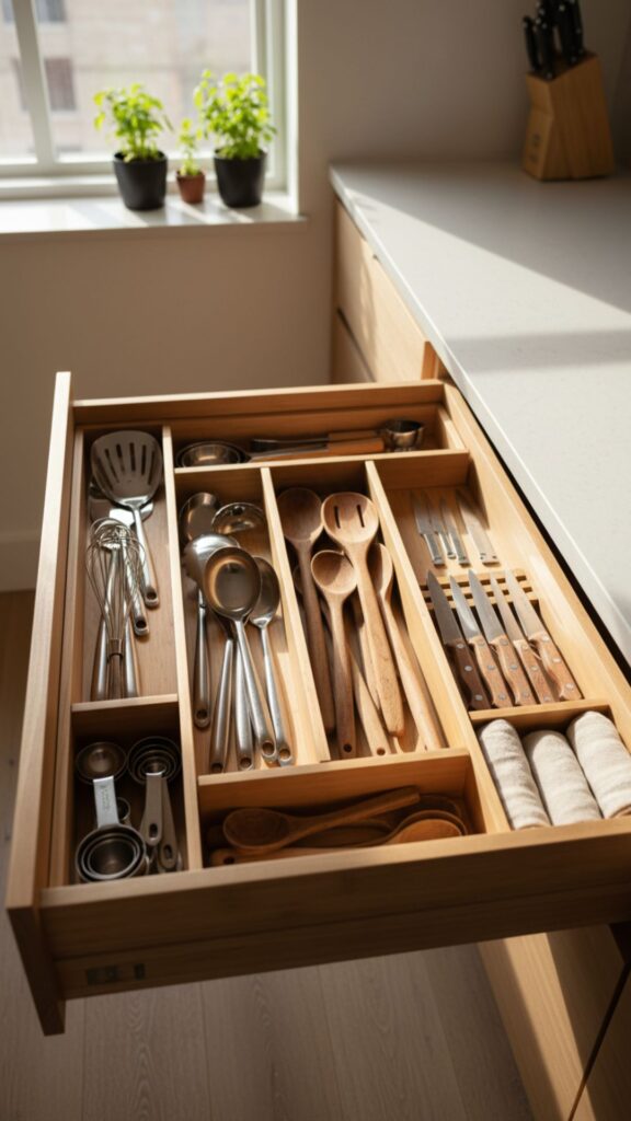 The inside of your drawers should be just as beautiful as the outside. Using natural wood organizers, like bamboo or maple, brings warmth to the interior of your cabinetry. It turns the chaotic “junk drawer” into a serene space where every utensil has a home, reinforcing the simple, organized farmhouse lifestyle.