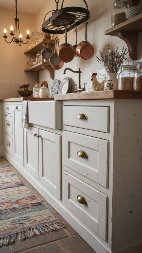 The distressed look is a hallmark of farmhouse style. A slightly weathered white finish on shaker-style drawers suggests that the kitchen has been loved and used for generations. It adds texture and depth that a flat, perfect paint job simply cannot achieve.