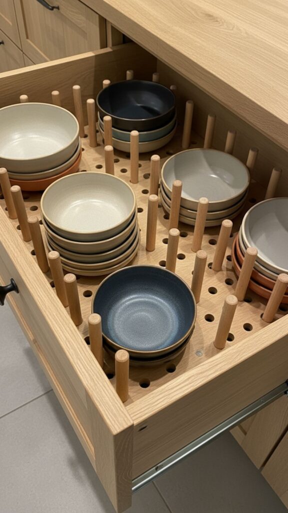Deep drawers benefit greatly from pegboard systems or adjustable dividers. These allow you to secure stacks of plates, bowls, or even pots and pans so they don’t slide around when the drawer is opened and closed.