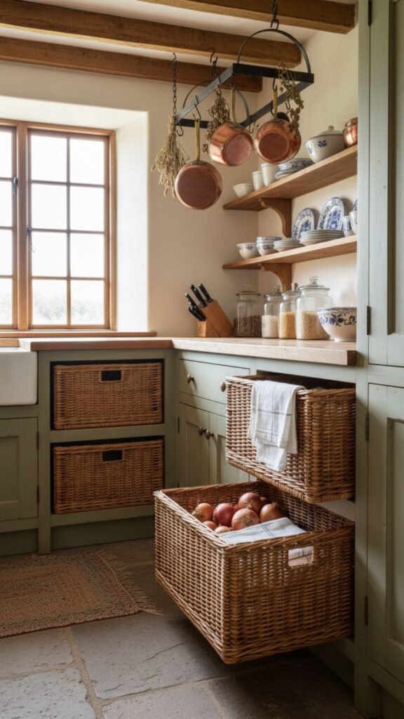 For a softer texture, consider replacing standard lower drawers with pull-out wicker baskets. This adds incredible warmth and texture, breaking up the monotony of wood cabinets. It is a quintessential farmhouse look that serves perfectly for storing onions, potatoes, or linens.