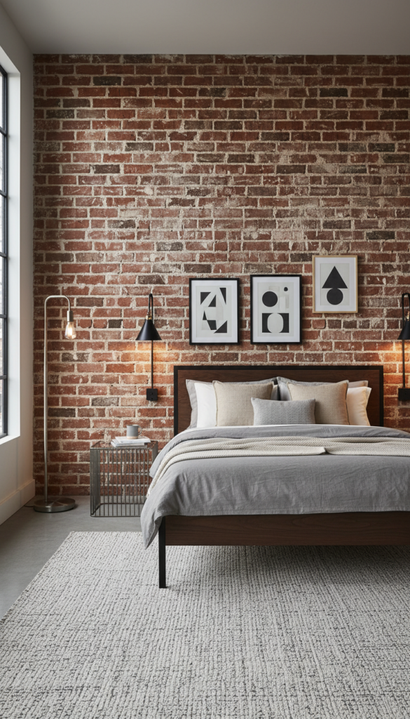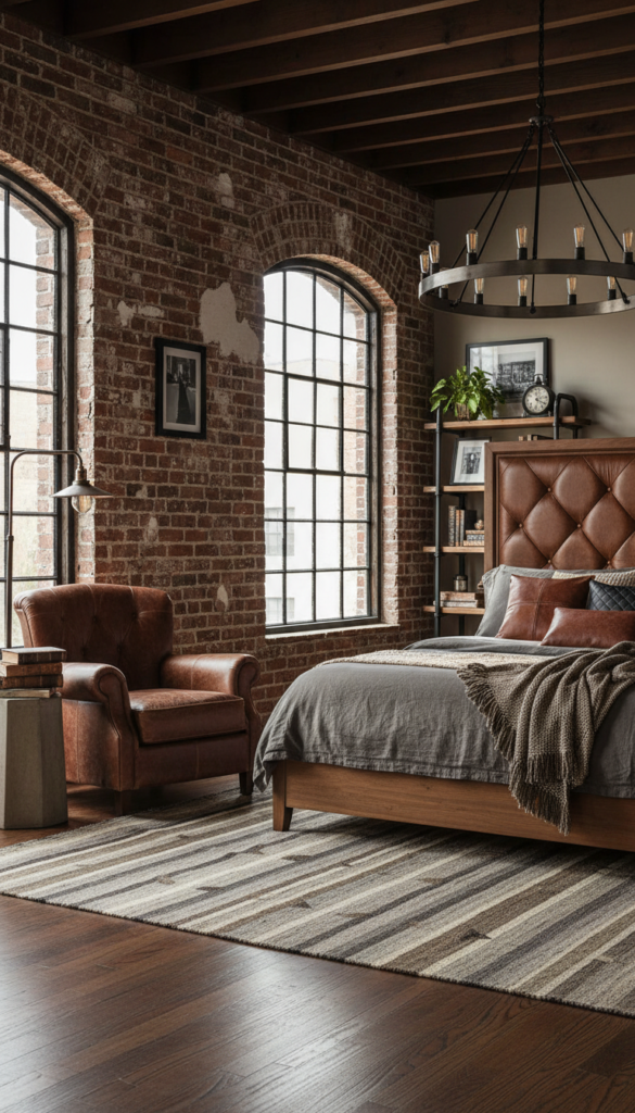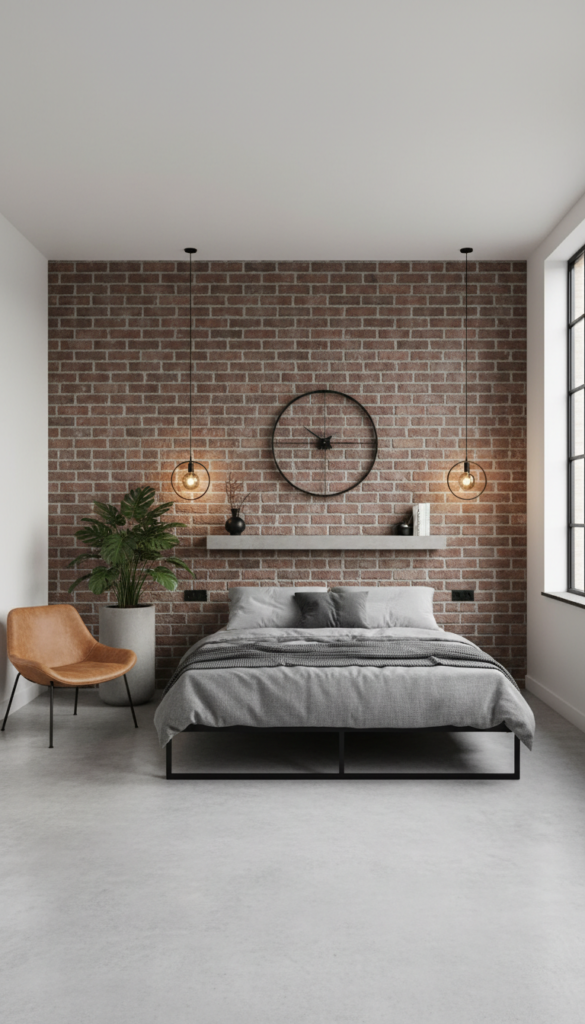 The industrial bedroom aesthetic combines raw materials like exposed brick, metal, concrete, and reclaimed wood, creating a masculine, minimalist, and rugged atmosphere.