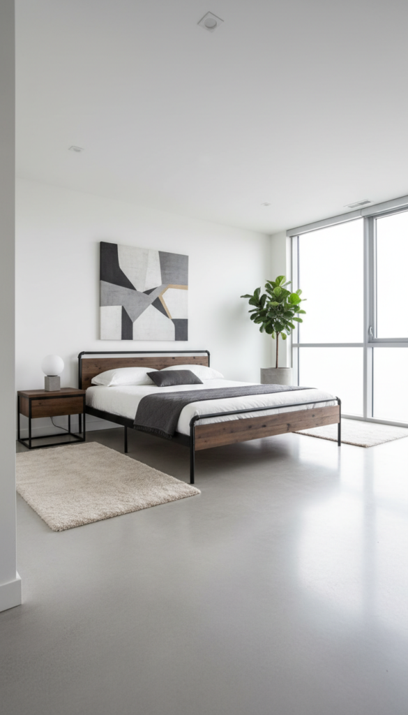 If you’re going for an industrial bedroom aesthetic, concrete floors are a must-have. The sleek, minimalist look of polished concrete brings an urban, almost factory-like quality to the space, making it perfect for those seeking something unique and bold.