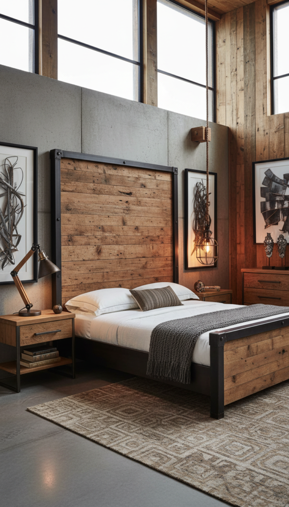 A reclaimed wood headboard paired with a steel bed frame is a great starting point. You can also add wooden shelves, a metal reading lamp, or even a wooden desk with metal legs to complete the look.
