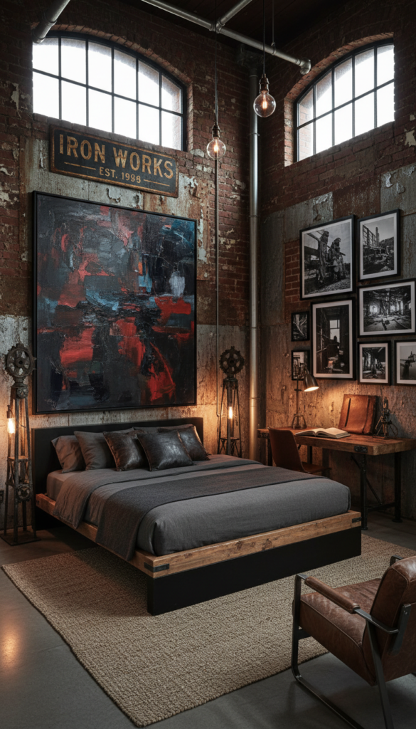 No industrial bedroom is complete without a few carefully selected pieces of artwork or décor that reflect the style. Opt for large, bold artworks or black-and-white photography that complements the industrial vibe. Metal sculptures, vintage posters, or abstract pieces can all work well.