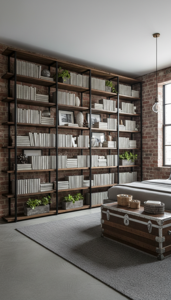 Storage solutions in an industrial bedroom should be as functional as they are stylish. Opt for open shelving units made of metal or reclaimed wood. These shelves can hold books, decorative items, or even industrial-style storage baskets for added organization.