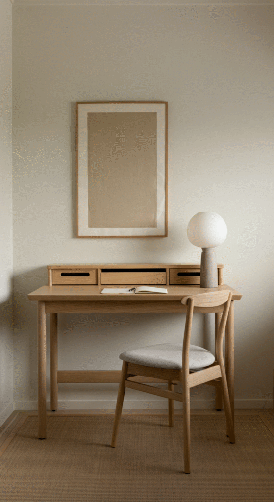 Pair the desk with a simple chair in light oak or soft beige fabric. Keep the surface clear except for your laptop, a single pen holder, and maybe a small candle for gentle energy.