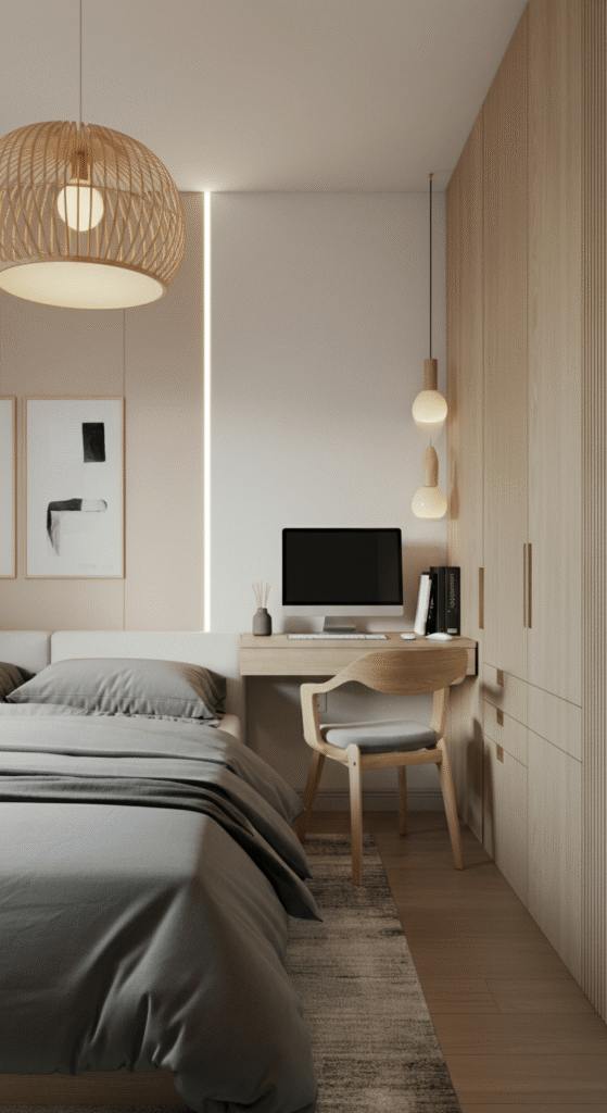 When your bedroom also becomes your office, your mind can get confused between rest and work. Japandi style solves this using simple zoning tricks.