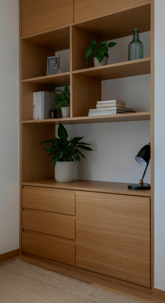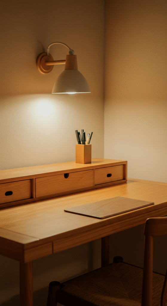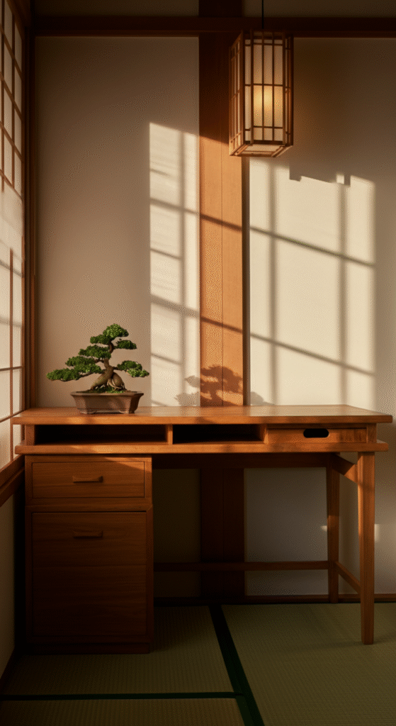 A clean wooden desk with low height sets the tone for a peaceful workspace. Japandi design avoids bulky or flashy furniture. Instead, it prefers natural wood that gives warmth, balance, and a grounded feeling.