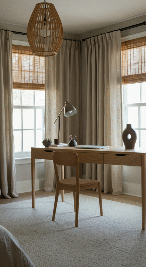 Japandi design loves textures. They pull the room together without feeling heavy. Natural textures add warmth, depth, and a peaceful vibe to your work area.