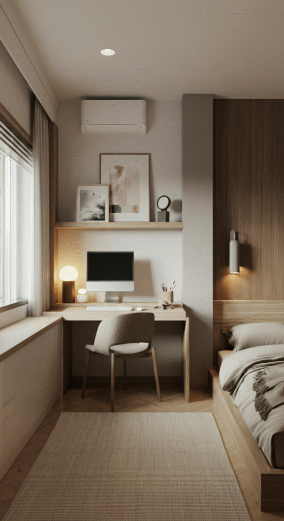 Paint your walls in warm white or stone beige, add an earthy fabric headboard, and let your workspace sit naturally inside the room without shouting for attention.