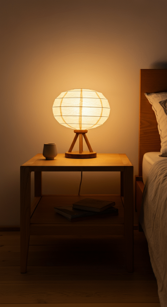 Lighting is everything in Japandi interiors. Your bedroom table needs a lamp that gives warm, diffused light instead of harsh brightness. A lamp with a paper shade, linen shade, or frosted glass works beautifully.