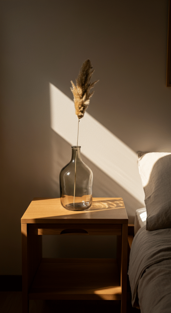 Nature is a huge part of Japandi interiors. A bedroom table feels instantly softer when you add a natural element. A small vase with a dried pampas stem, eucalyptus, or a single branch works beautifully.