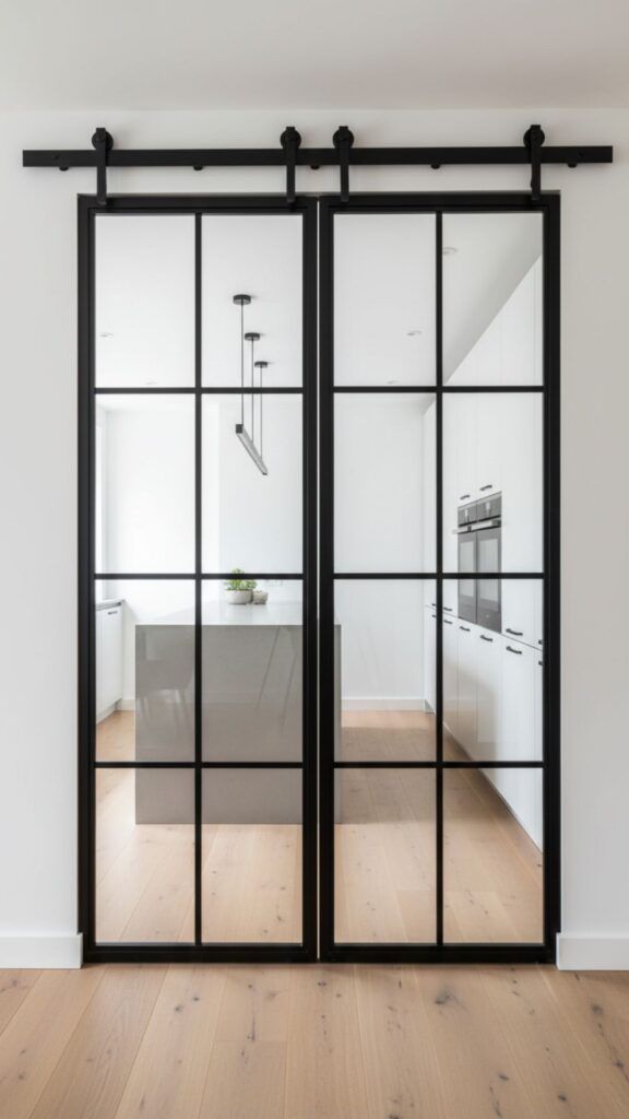 If you want to maintain an open feel while blocking noise and cooking smells, a steel-framed glass partition is the ultimate modern solution. It defines the entrance without sacrificing light.