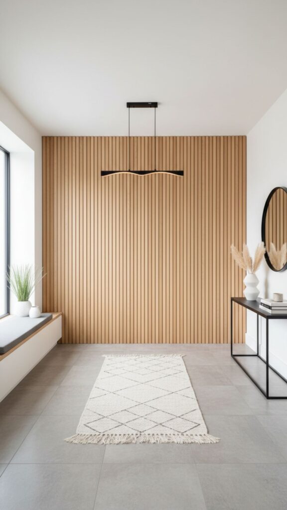 Vertical wood slats create a sophisticated “Japandi” vibe. Installing them on one side of the entrance draws the eye upward and adds organic warmth to a potentially sterile kitchen environment.