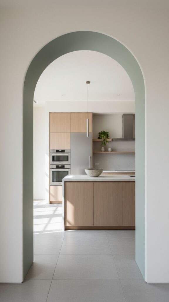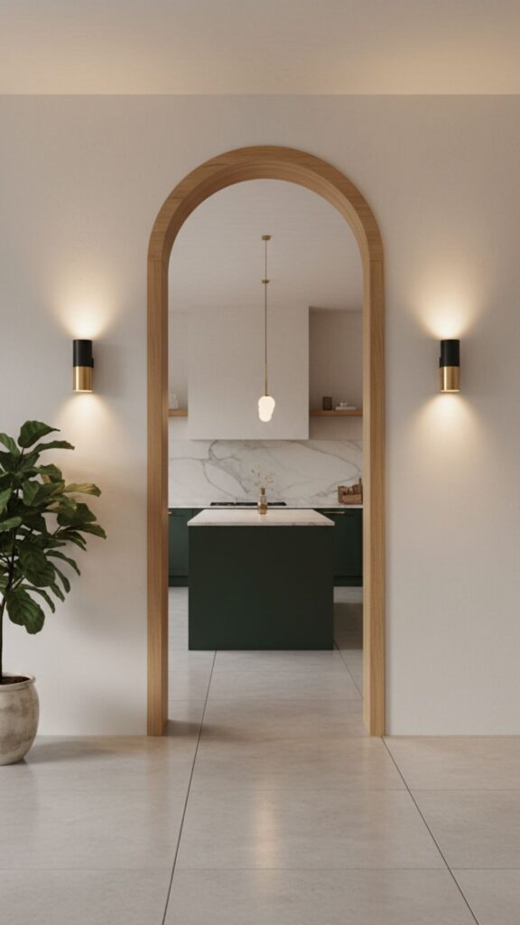 Sharp corners can feel clinical. Converting a standard rectangular doorway into an arch instantly makes a kitchen feel more organic, custom, and calming.
