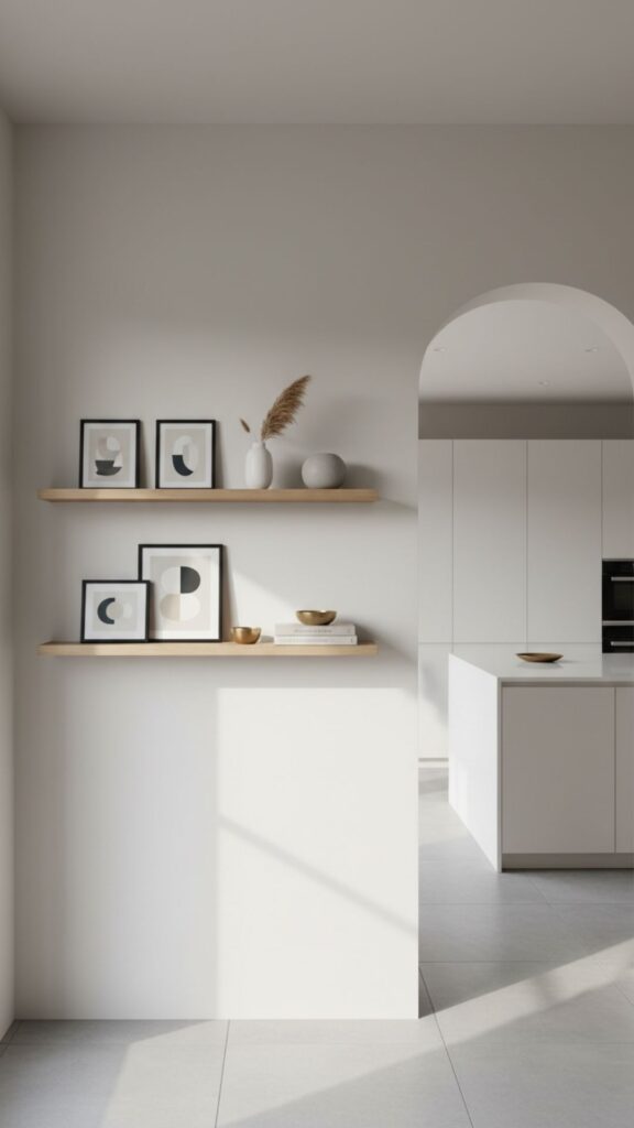 A gallery wall can feel too busy for a minimalist kitchen entrance. Instead, install two slim picture ledges or floating shelves. This allows you to lean art and swap it out, keeping the look airy and flexible.