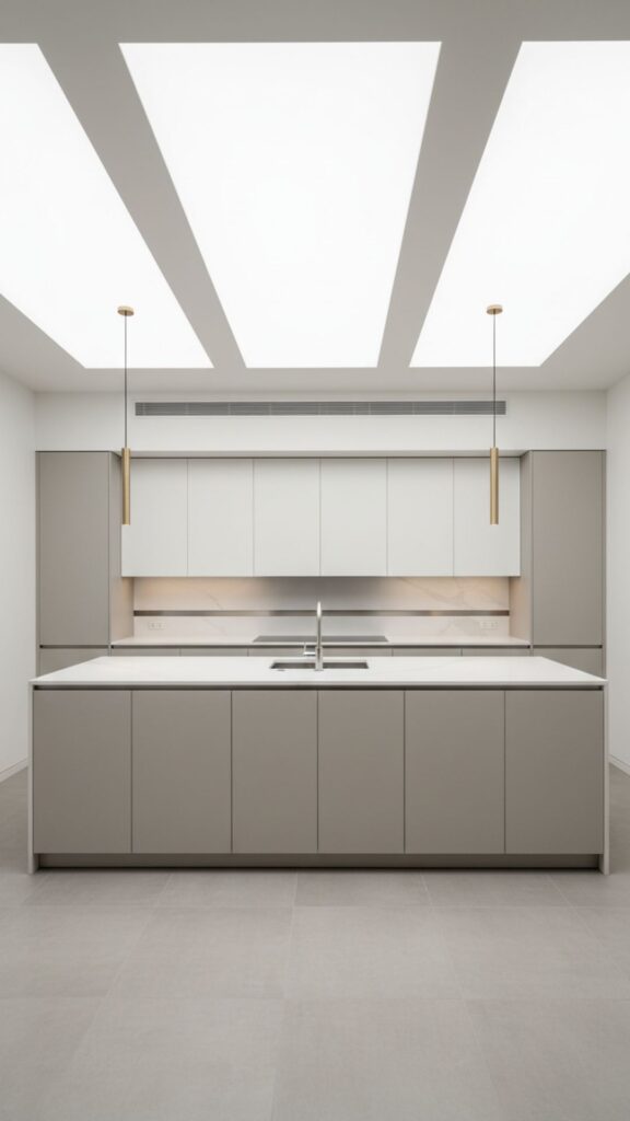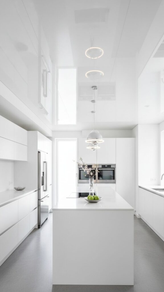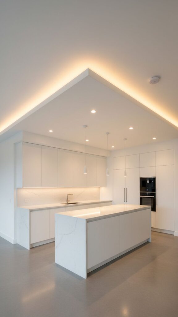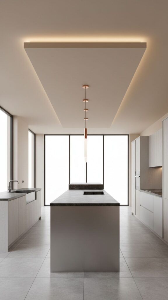 This design uses a peripheral drop ceiling with a hidden recess for LED strips. It creates a soft, diffused glow that eliminates harsh shadows, making the kitchen feel larger and ultra-clean.