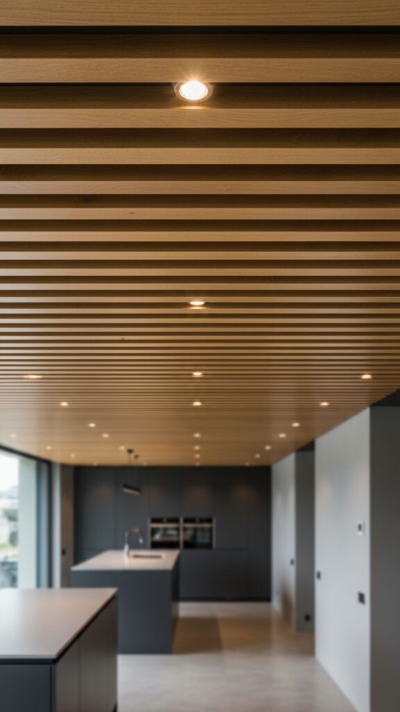 Bringing nature indoors creates a calm, clean atmosphere. Wooden slats installed in parallel lines offer texture without clutter. This linear design draws the eye upward and elongates the room.