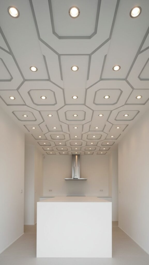 This design mirrors the kitchen island below. A suspended gypsum platform hangs centrally, providing a dedicated space for pendant lights or a heavy-duty chimney hood.