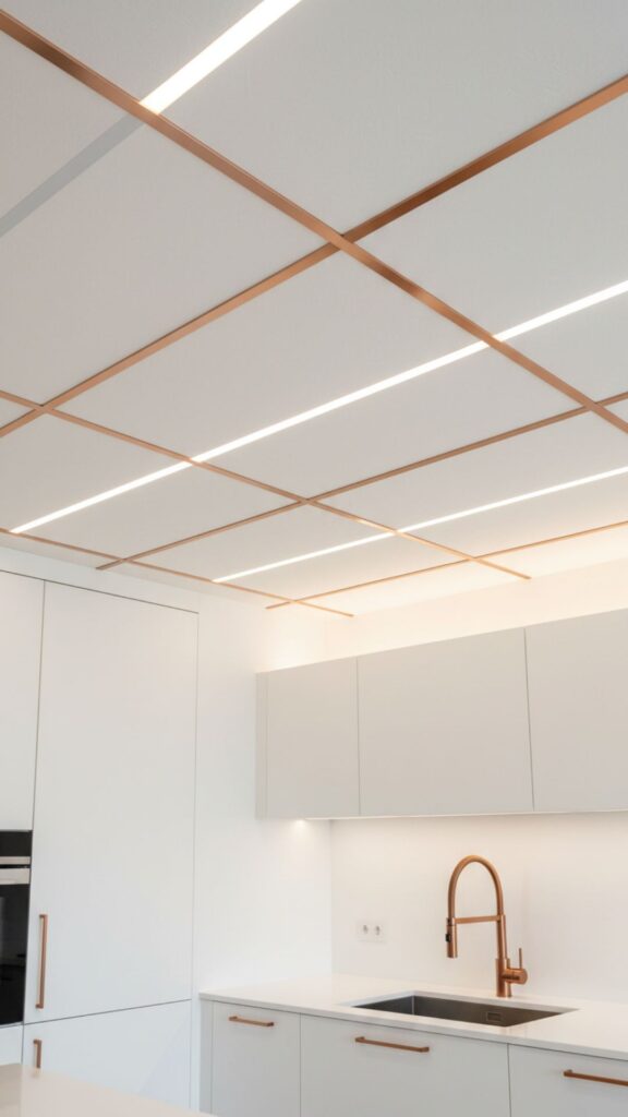 Adding a touch of gold, copper, or silver trim to a white ceiling breaks the monotony and adds a “super clean” luxury feel.